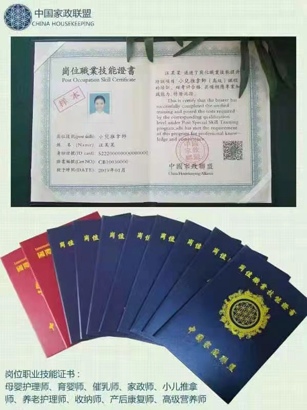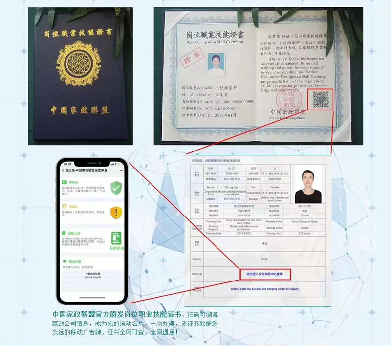 证书的权威性和专业性*权威性:全国性⾏业权威认证机构中国家政联盟颁发, 这是国内知名的⾼端家庭服务 平台的单位之⼀, 其颁发的证书具有国家权威认证。